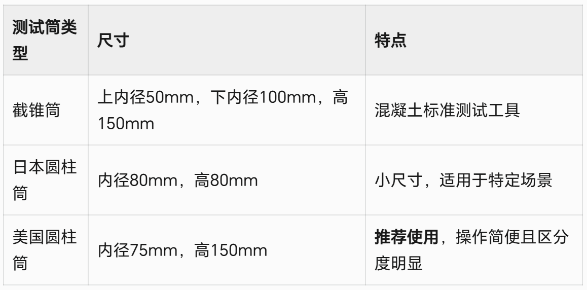 不同測(cè)試筒類型和尺寸會(huì)影響流動(dòng)度結(jié)果,常見(jiàn)類型包括: